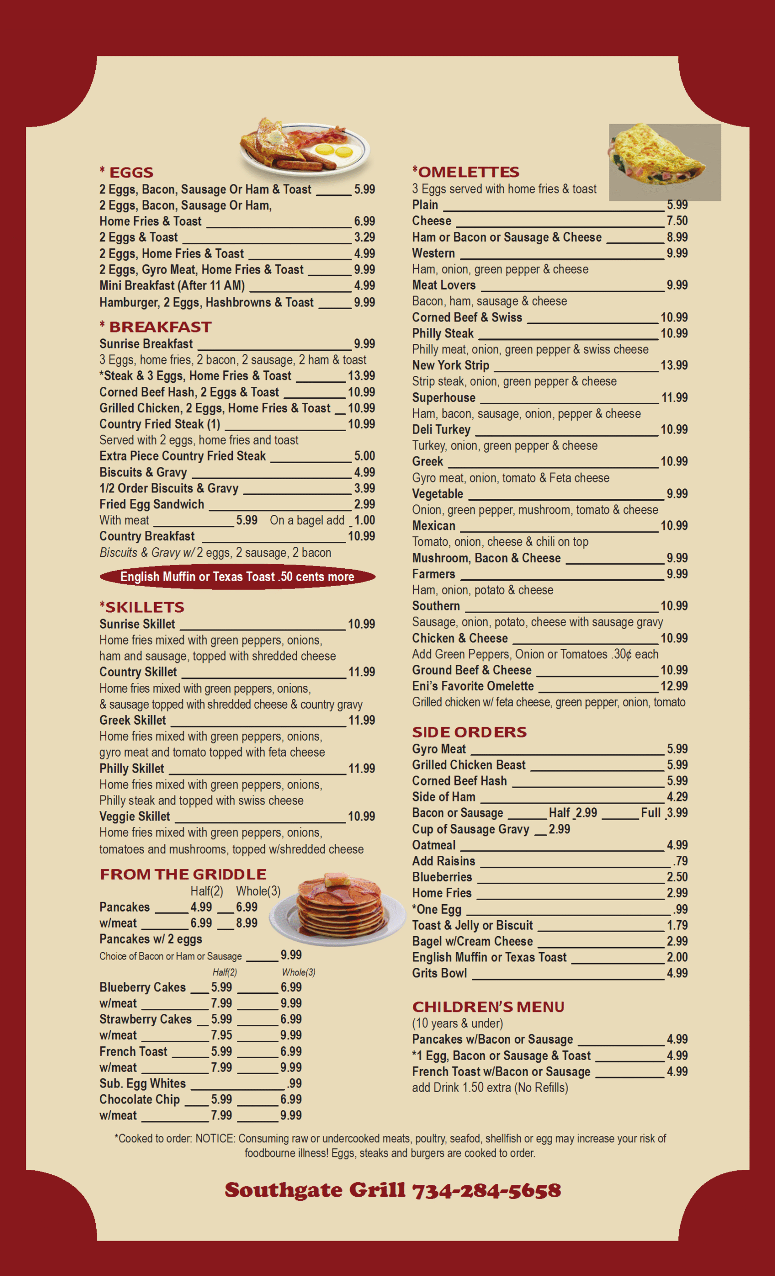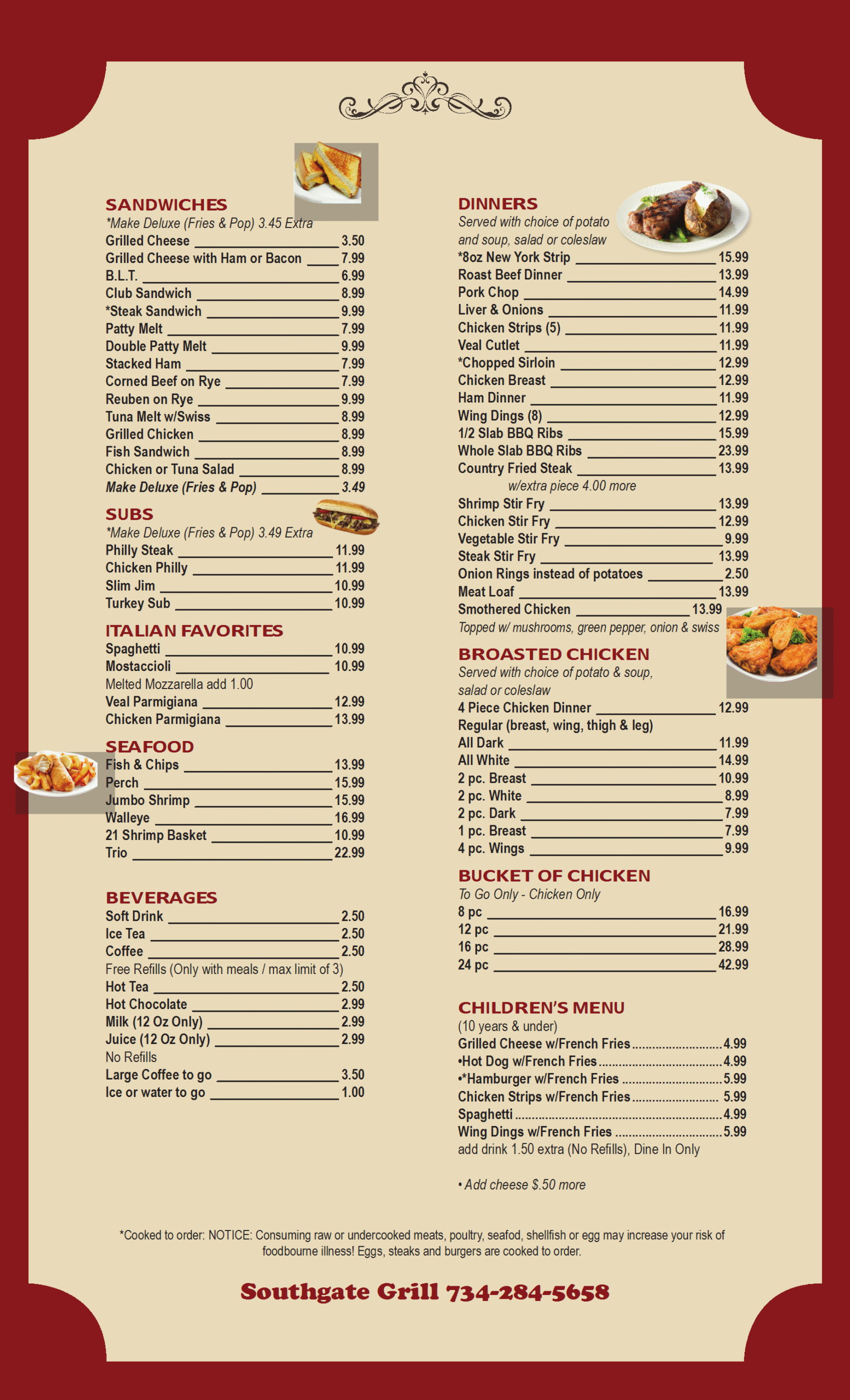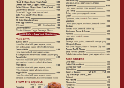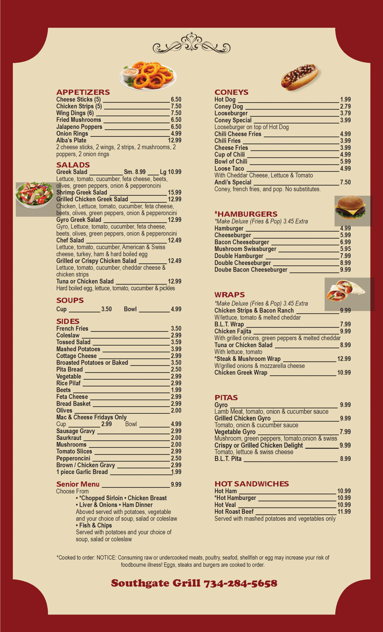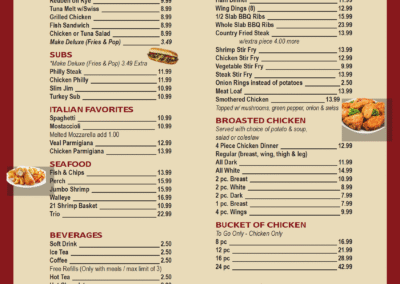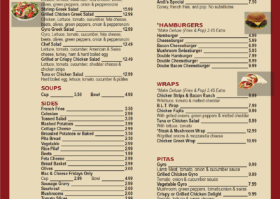 Our menu is huge! In addition to breakfast that’s served all day long (hello McDonalds!) we have dishes for every taste: appetizers, salads, Soups, Coneys, Hamburgers, Wraps, Pitas, Hot and Cold Sandwiches, Subs, Italian Favorites, Seafood, Dinners, Broasted Chicken. Click below for a larger version